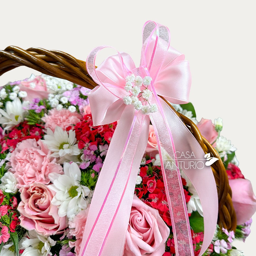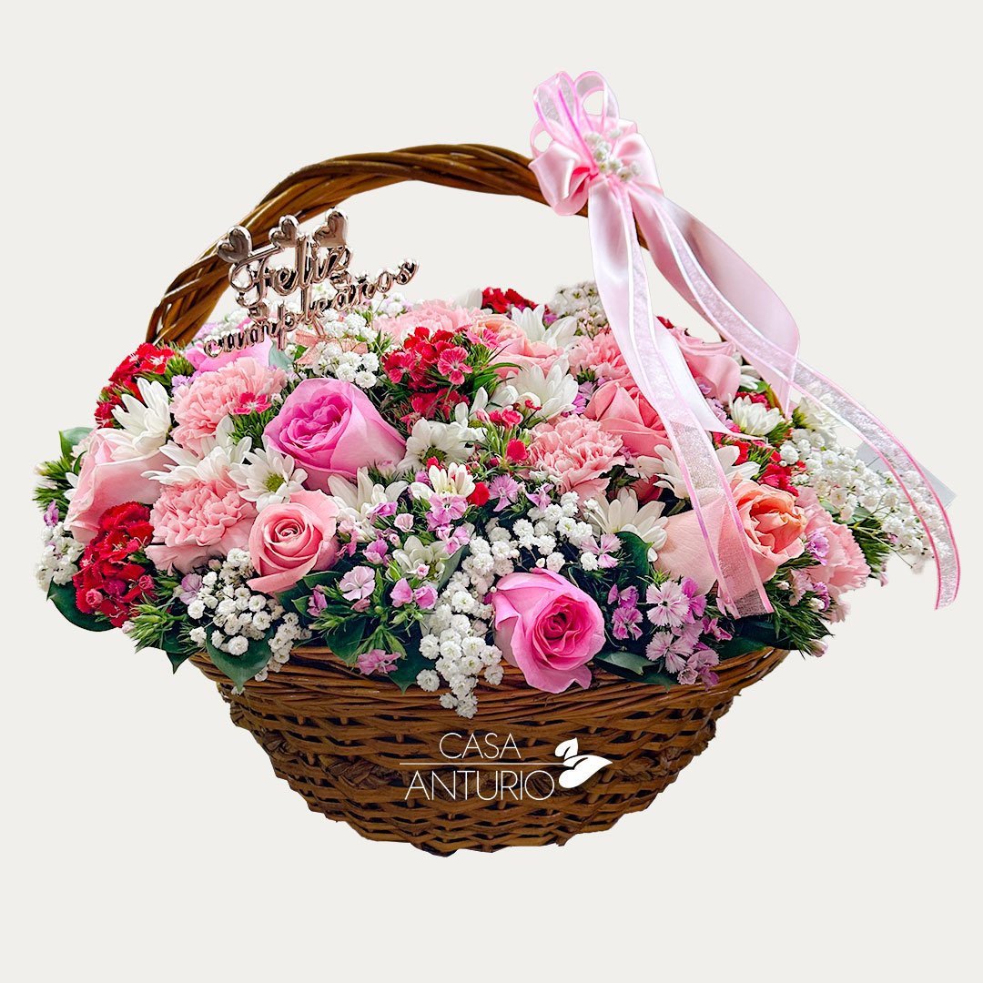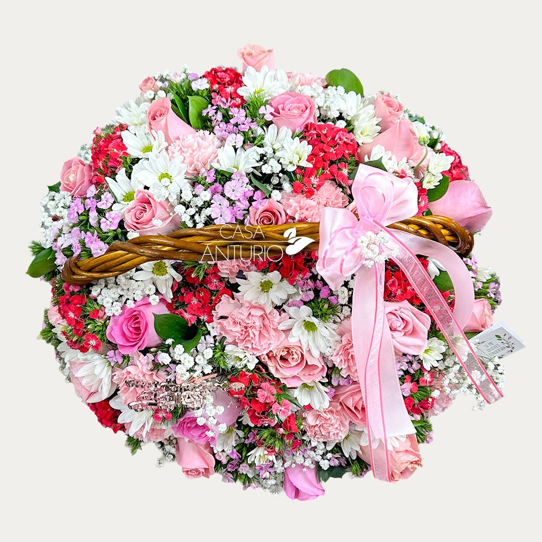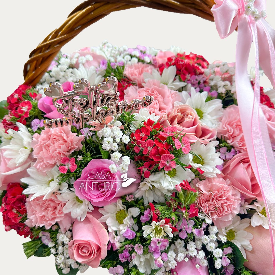 Canasta de 24 rosas con perla, margaritas, claveles y diversos follajes. Un diseño encantador y elegante en presentación tipo canasta, lleno de color, frescura y detalles delicados que resaltan la belleza natural de cada flor. Perfecto para regalar en ocasiones especiales y transmitir cariño, gratitud o admiración. Incluye tarjeta impresa personalizada para que tu mensaje haga este detalle aún más especial.