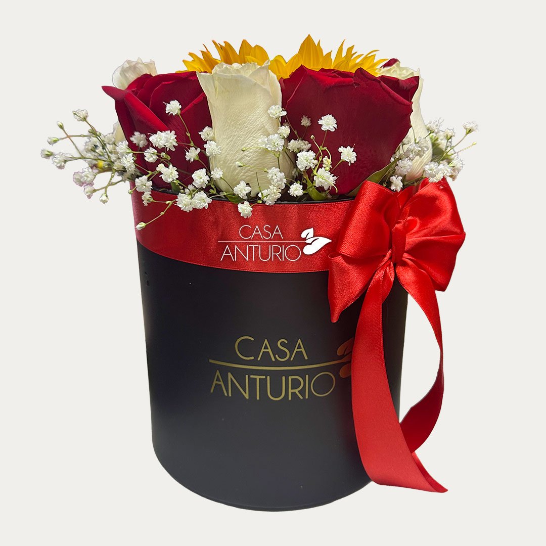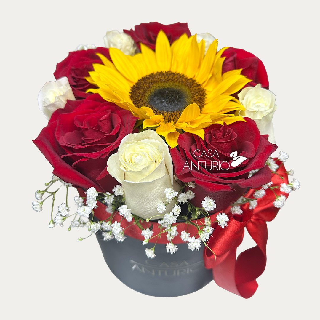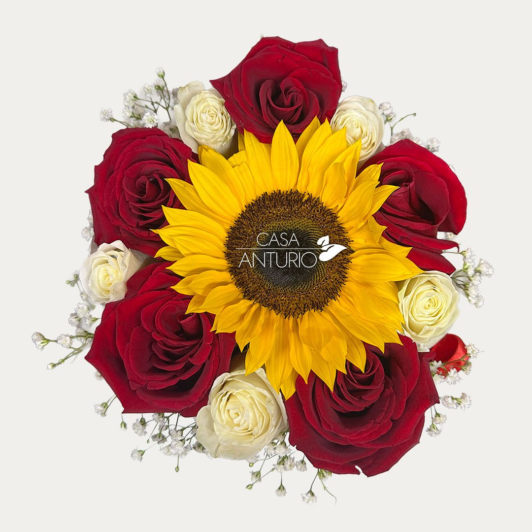 Arreglo floral elaborado en base circular negra con entre 12 – 15 rosas, girasol, perla y moño decorativo, una combinación elegante y sofisticada que resalta por su contraste, color y presentación especial. La intensidad de las rosas se une con la energía del girasol y la delicadeza de la perla, creando un diseño armonioso, moderno y lleno de encanto, ideal para sorprender en cumpleaños, aniversarios o cualquier ocasión memorable. Incluye tarjeta impresa personalizada para que tu mensaje haga este detalle aún más especial.