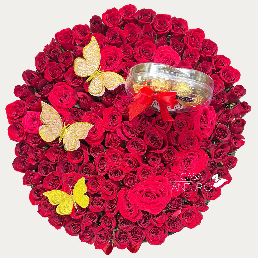 Arreglo Circular Gigante de Rosas con Mariposas y Chocolates