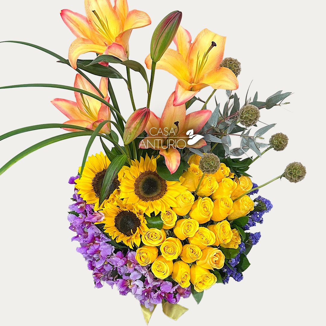 Arreglo de Rosas Amarillas, Girasoles, Orquidea y Lirios