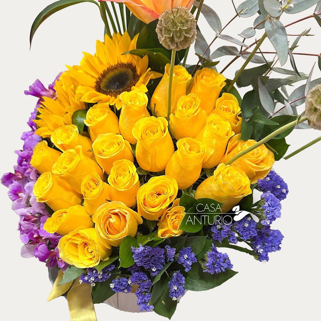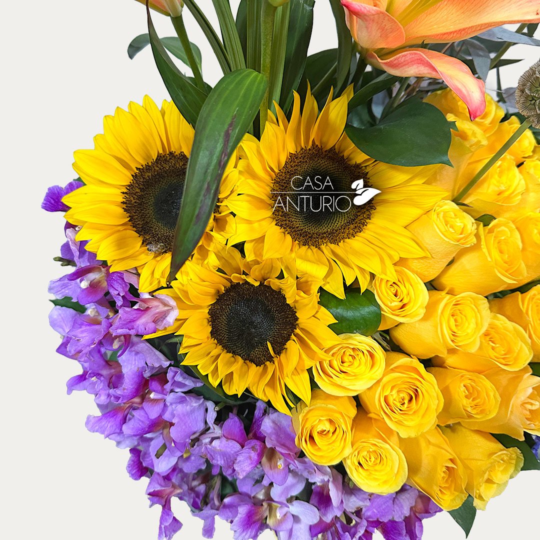 Nota importante: En Casa Anturio trabajamos con flores 100% naturales, cuidadosamente seleccionadas para garantizar frescura y calidad en cada arreglo. Debido a su origen natural, es posible que presenten ligeras variaciones en color, tamaño o forma. Por lo tanto, el producto final puede diferir sutilmente de la imagen de referencia. Sin embargo, te aseguramos que siempre mantendremos la armonía, el estilo y la belleza que caracterizan a nuestros diseños florales.
