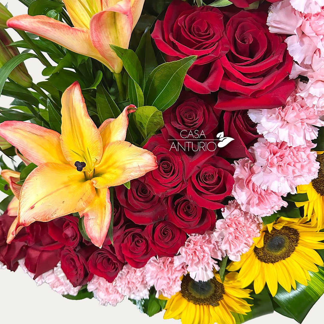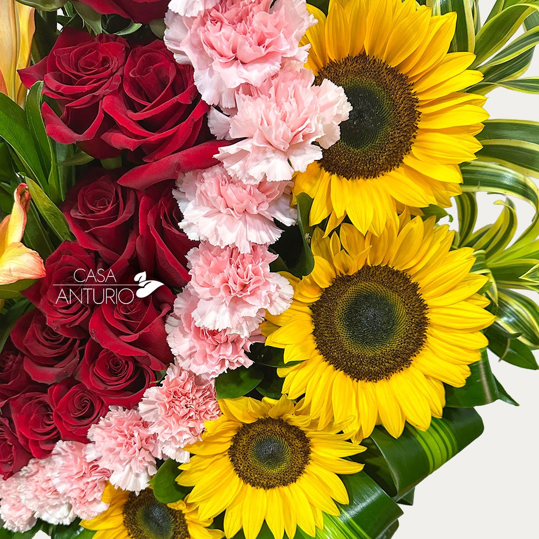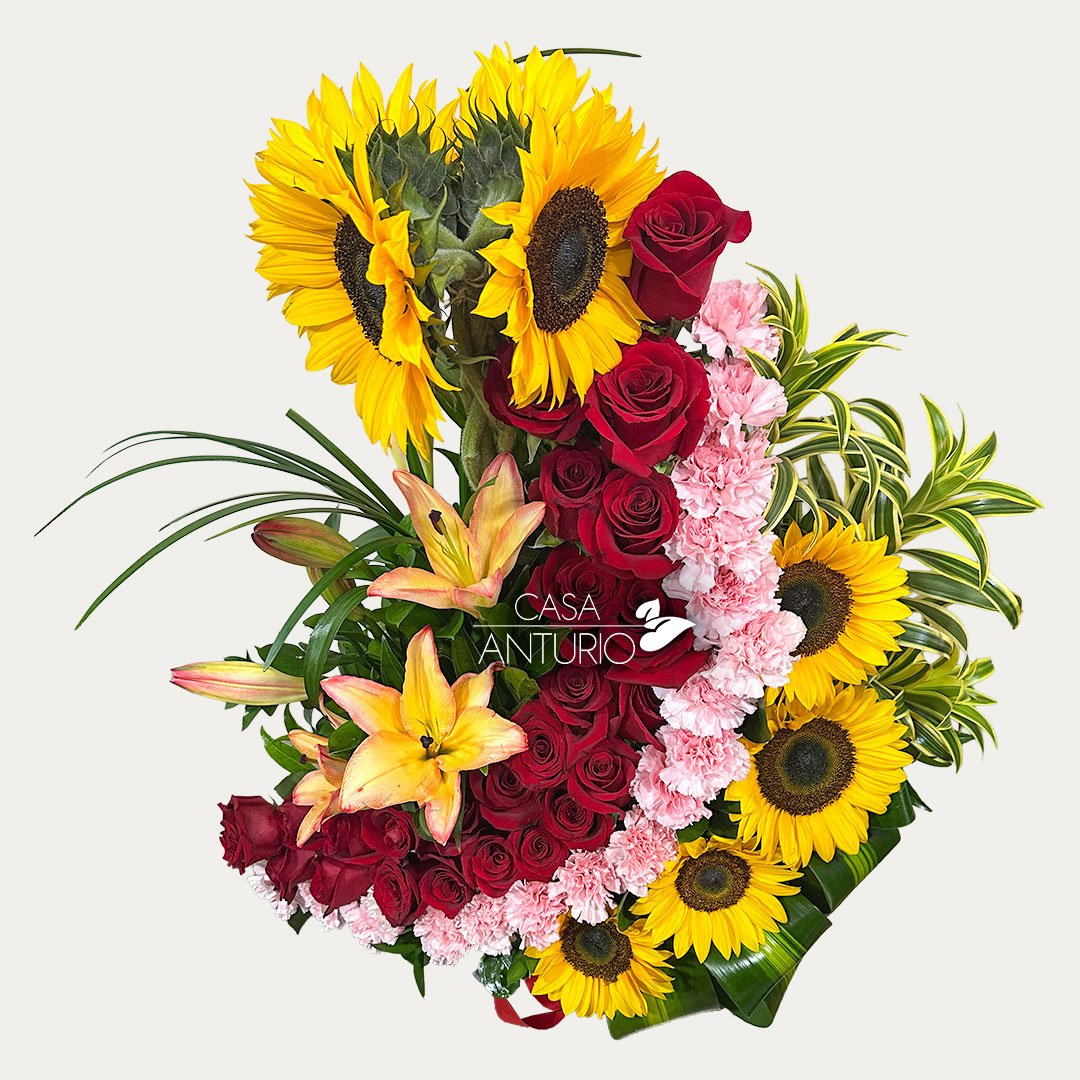 Arreglo de 24 rosas rojas, cláveles, 8 girasoles y lirios. Una combinación impactante de flores que mezcla el romanticismo de las rosas, la calidez de los girasoles y la elegancia de los lirios, creando un detalle lleno de fuerza, luz y sentimiento. Ideal para sorprender en grandes ocasiones, expresar amor profundo o celebrar momentos inolvidables. Incluye tarjeta impresa personalizada para que tu mensaje haga este detalle aún más especial.