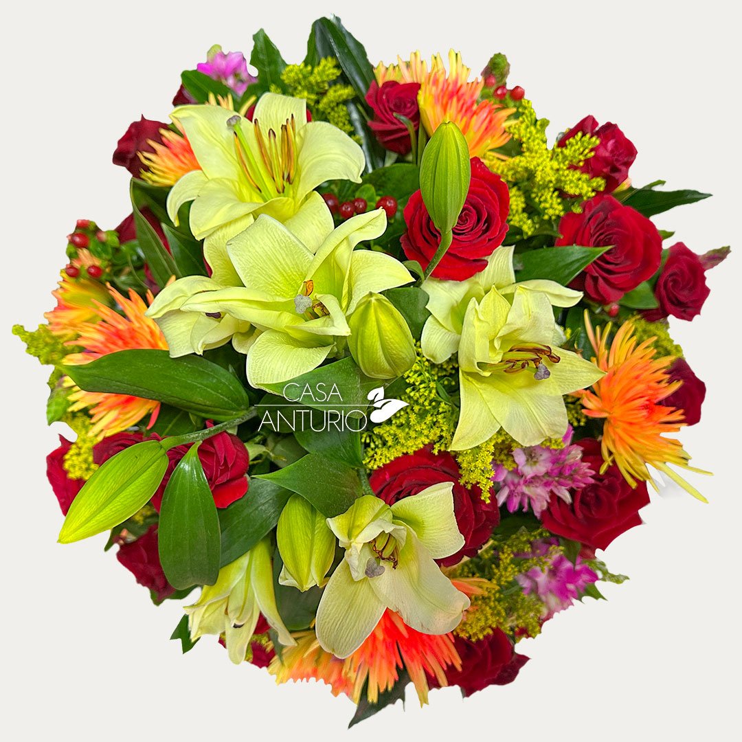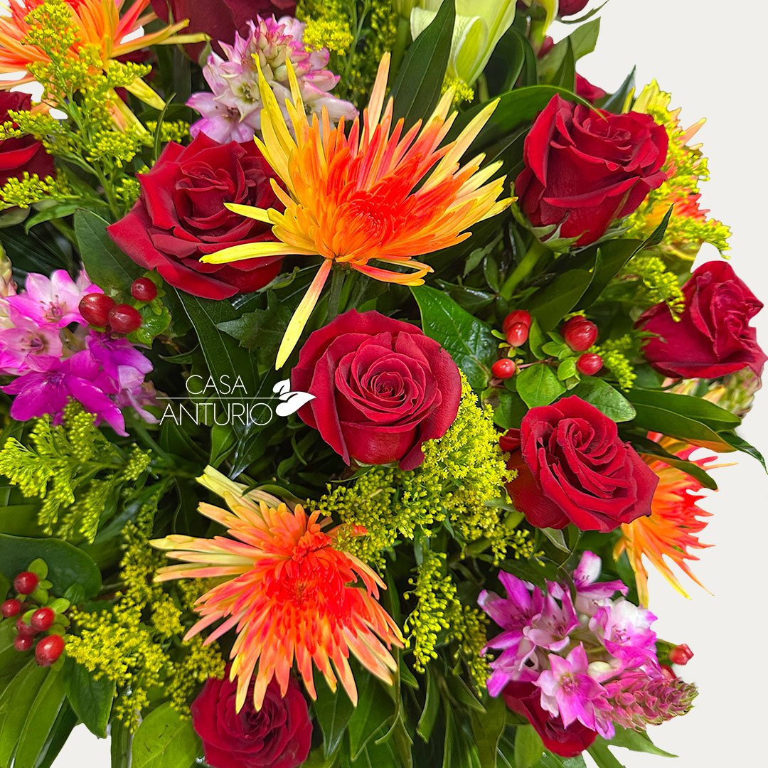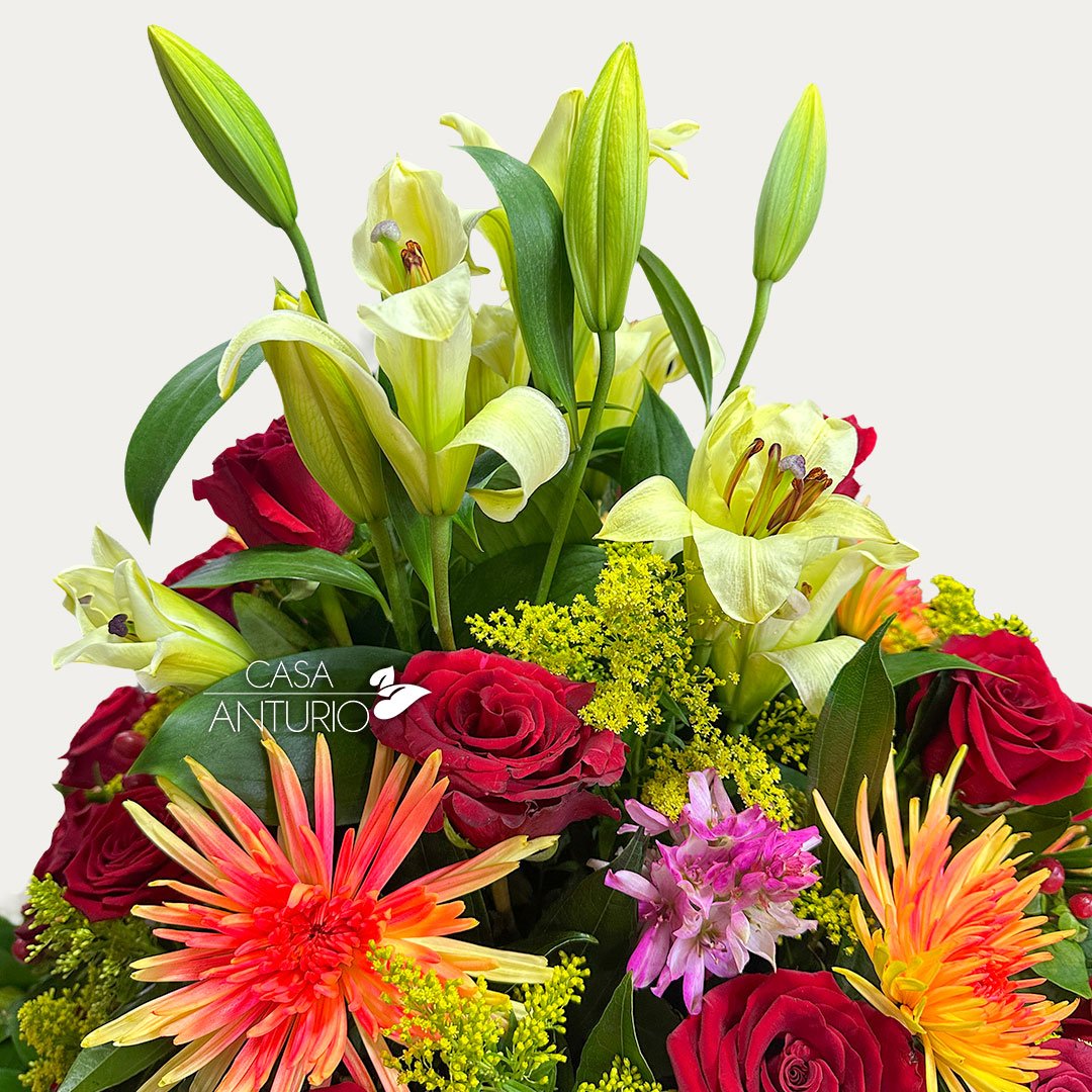 Nota importante: En Casa Anturio trabajamos con flores 100% naturales, cuidadosamente seleccionadas para garantizar frescura y calidad en cada arreglo. Debido a su origen natural, es posible que presenten ligeras variaciones en color, tamaño o forma. Por lo tanto, el producto final puede diferir sutilmente de la imagen de referencia. Sin embargo, te aseguramos que siempre mantendremos la armonía, el estilo y la belleza que caracterizan a nuestros diseños florales.