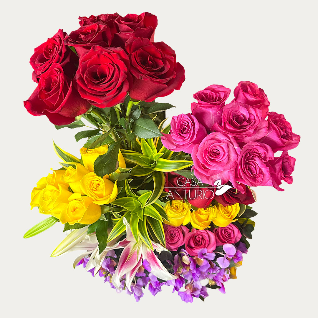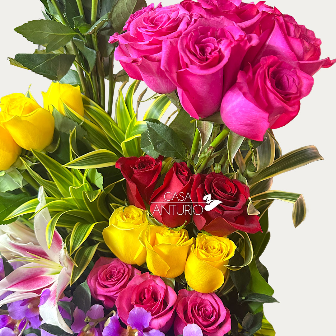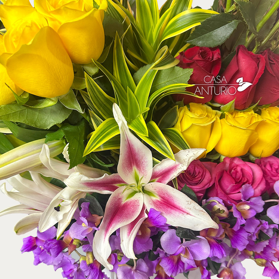 Arreglo floral elaborado con 36 rosas en tonos rojos, fucsia y amarillos, acompañado de lirios y orquídea hawaiana, una combinación impactante y llena de color que transmite amor, alegría y admiración. La intensidad de las rosas se une con la elegancia de los lirios y el toque exótico de la orquídea hawaiana, dando como resultado un diseño sofisticado y muy especial, ideal para sorprender y celebrar momentos inolvidables. Incluye tarjeta impresa personalizada para que tu mensaje haga este detalle aún más especial.