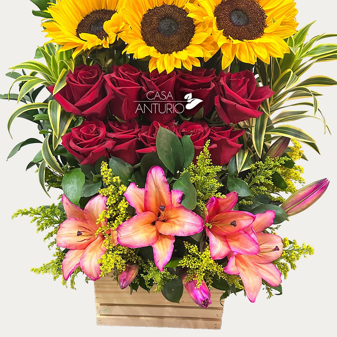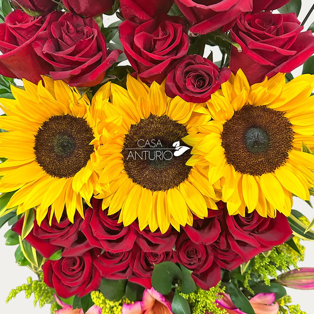 Nota importante: En Casa Anturio trabajamos con flores 100% naturales, cuidadosamente seleccionadas para garantizar frescura y calidad en cada arreglo. Debido a su origen natural, es posible que presenten ligeras variaciones en color, tamaño o forma. Por lo tanto, el producto final puede diferir sutilmente de la imagen de referencia. Sin embargo, te aseguramos que siempre mantendremos la armonía, el estilo y la belleza que caracterizan a nuestros diseños florales.