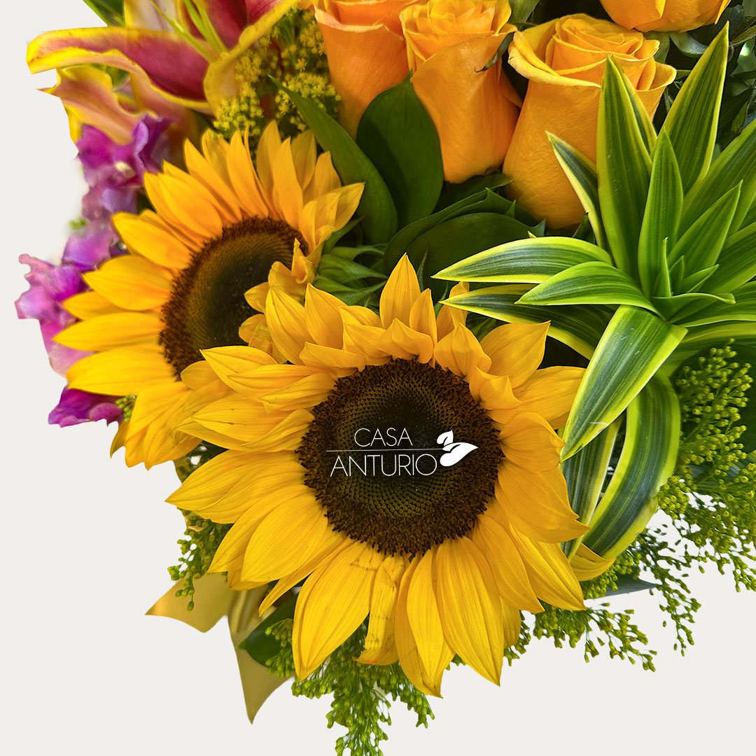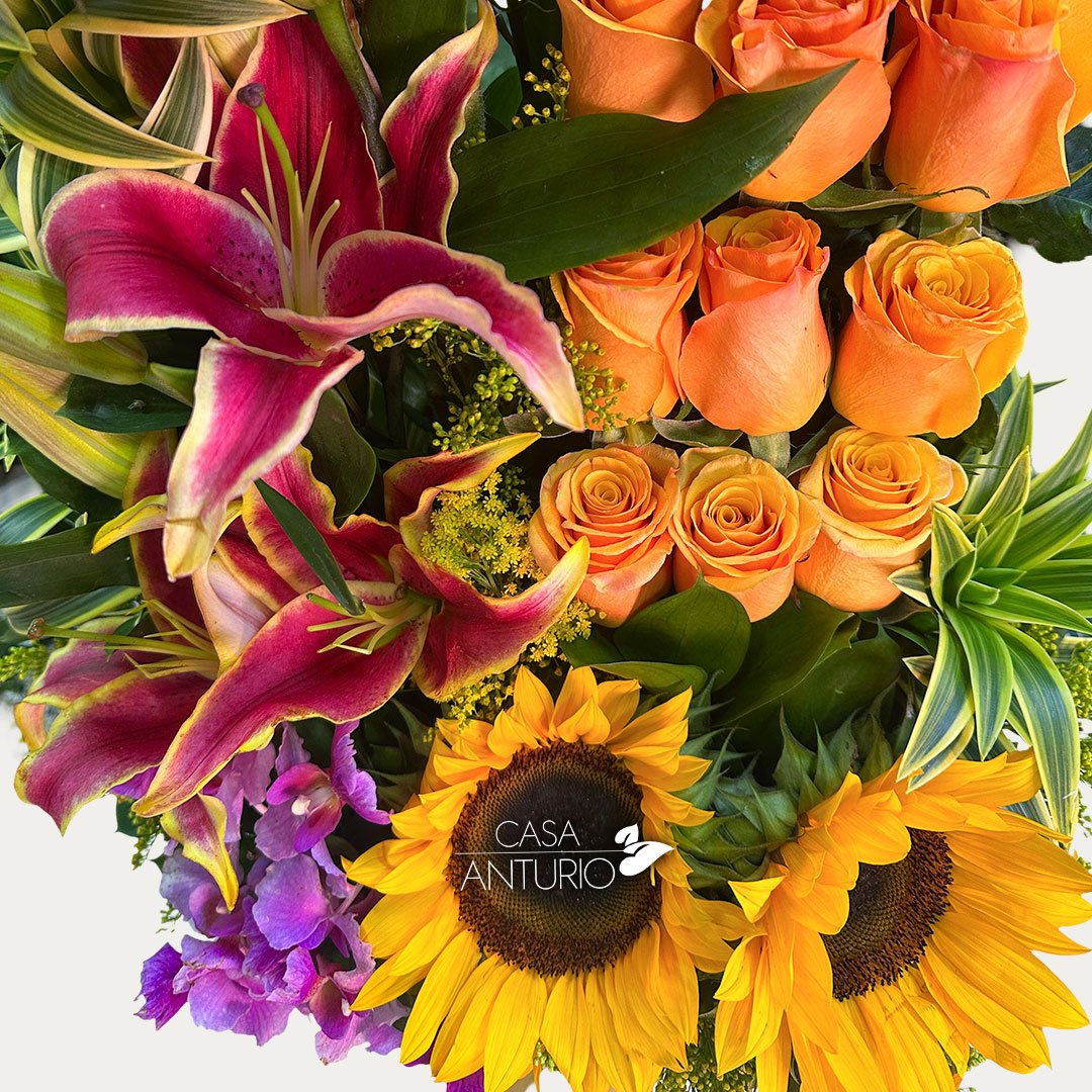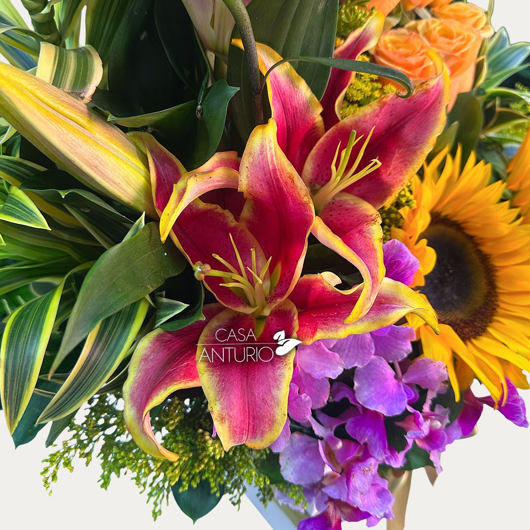 Nota importante: En Casa Anturio trabajamos con flores 100% naturales, cuidadosamente seleccionadas para garantizar frescura y calidad en cada arreglo. Debido a su origen natural, es posible que presenten ligeras variaciones en color, tamaño o forma. Por lo tanto, el producto final puede diferir sutilmente de la imagen de referencia. Sin embargo, te aseguramos que siempre mantendremos la armonía, el estilo y la belleza que caracterizan a nuestros diseños florales.