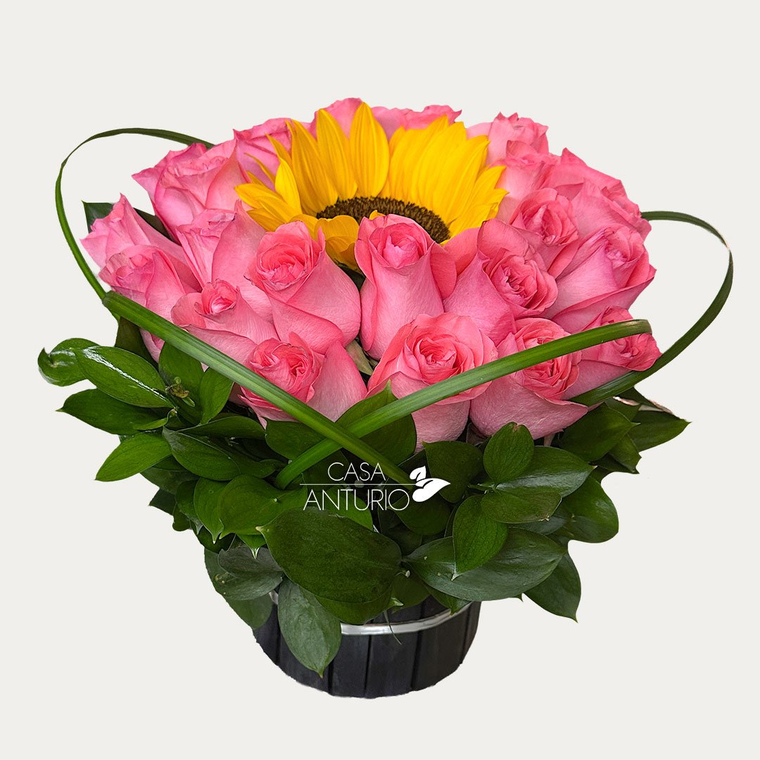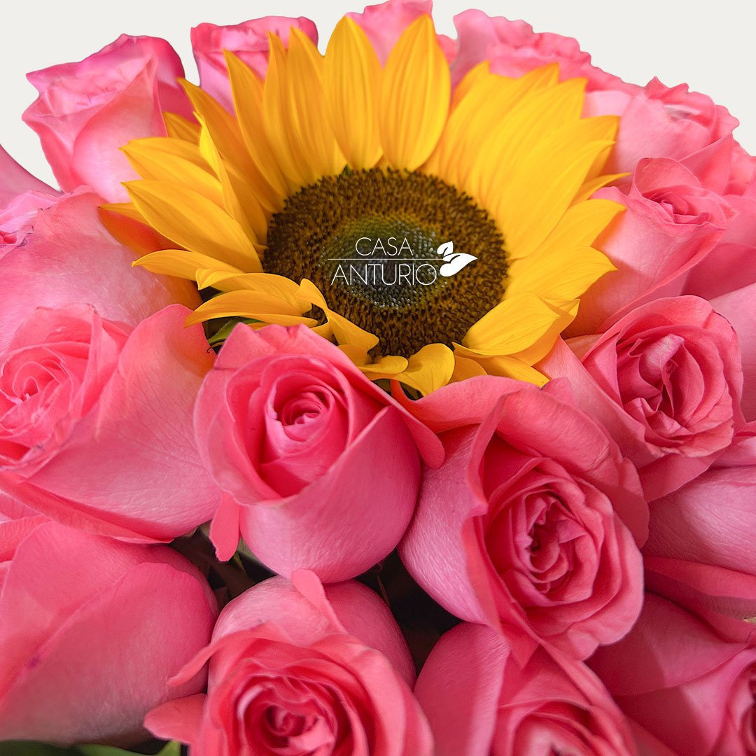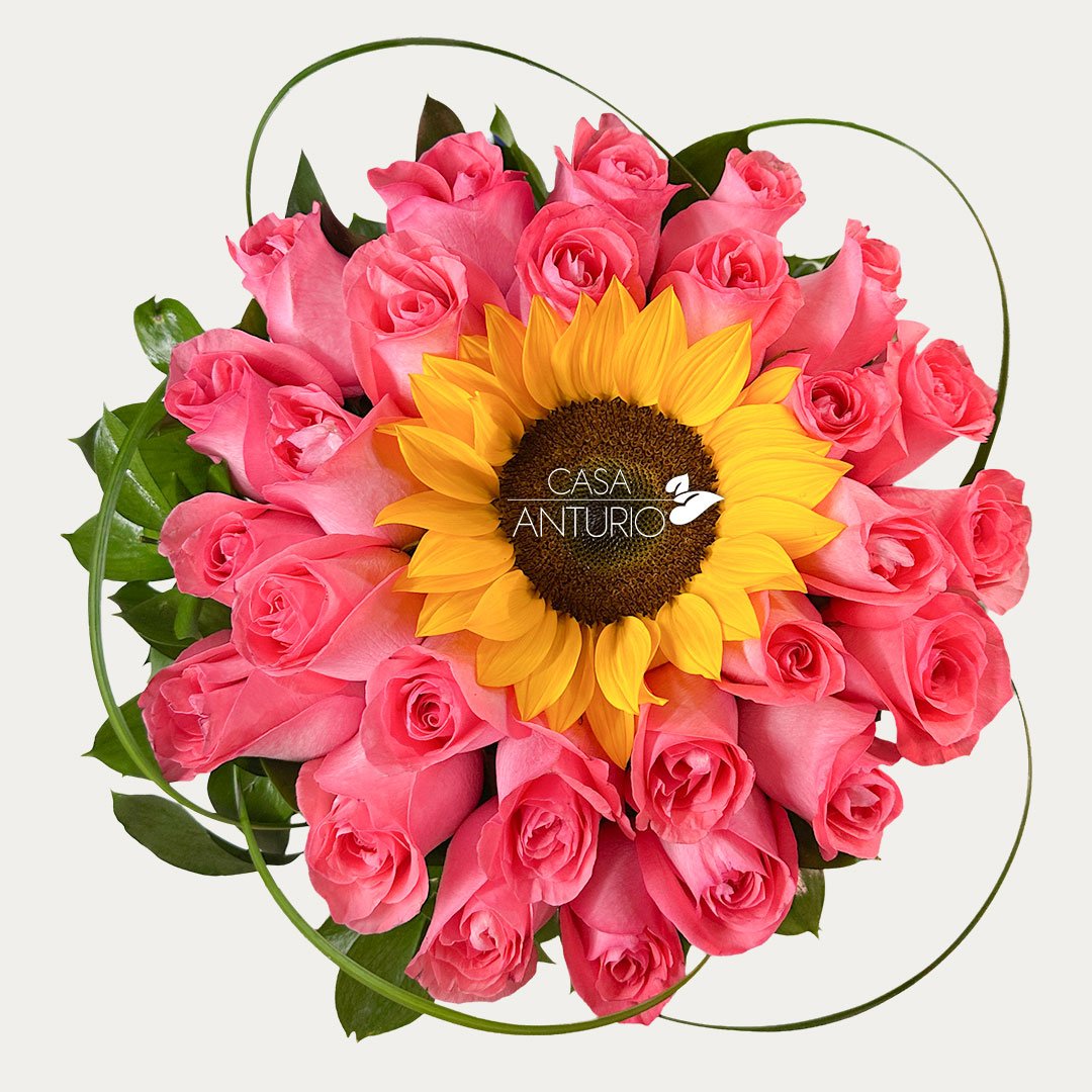 Arreglo floral elaborado con entre 24 – 30 rosas y girasol, una combinación elegante y llena de alegría que transmite amor, admiración y buenos sentimientos. La belleza de las rosas se complementa con la energía del girasol, creando un diseño armonioso, especial y perfecto para sorprender en cualquier ocasión. Incluye tarjeta impresa personalizada para que tu mensaje haga este detalle aún más especial.