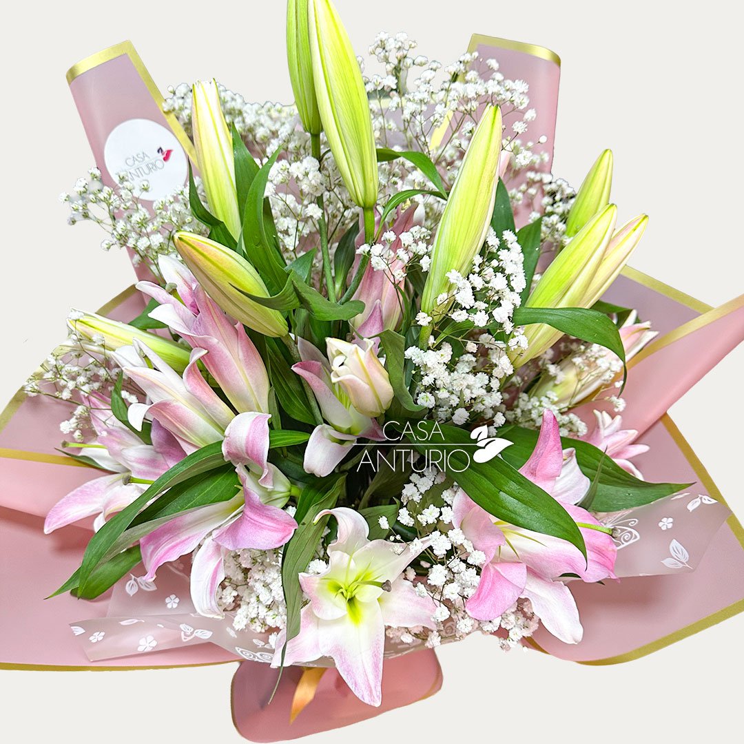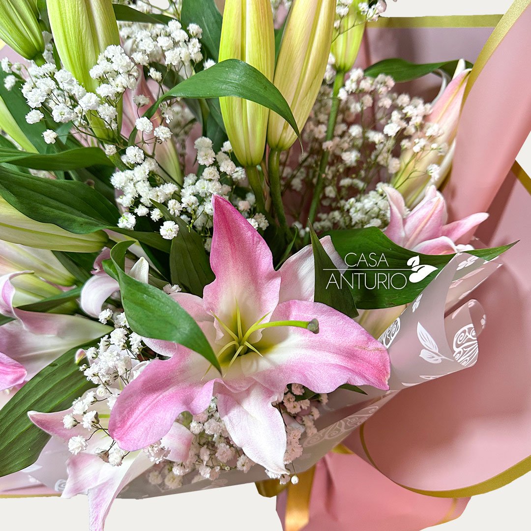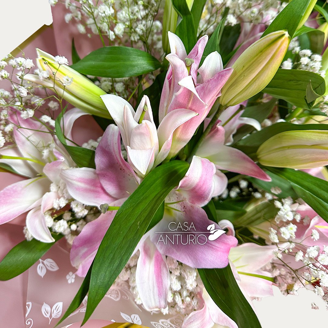 Nota importante: En Casa Anturio trabajamos con flores 100% naturales, cuidadosamente seleccionadas para garantizar frescura y calidad en cada arreglo. Debido a su origen natural, es posible que presenten ligeras variaciones en color, tamaño o forma. Por lo tanto, el producto final puede diferir sutilmente de la imagen de referencia. Sin embargo, te aseguramos que siempre mantendremos la armonía, el estilo y la belleza que caracterizan a nuestros diseños florales.