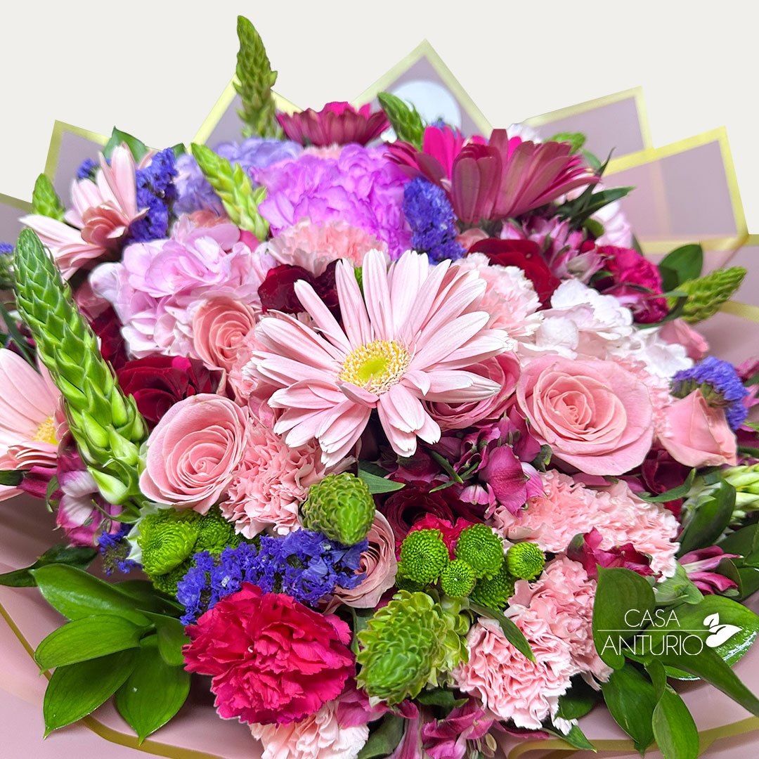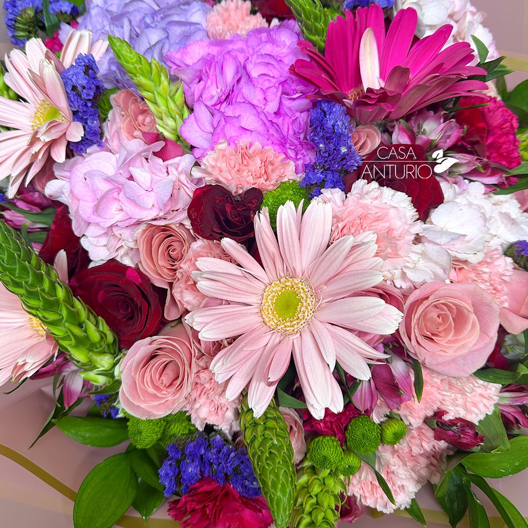 Nota importante: En Casa Anturio trabajamos con flores 100% naturales, cuidadosamente seleccionadas para garantizar frescura y calidad en cada arreglo. Debido a su origen natural, es posible que presenten ligeras variaciones en color, tamaño o forma. Por lo tanto, el producto final puede diferir sutilmente de la imagen de referencia. Sin embargo, te aseguramos que siempre mantendremos la armonía, el estilo y la belleza que caracterizan a nuestros diseños florales.