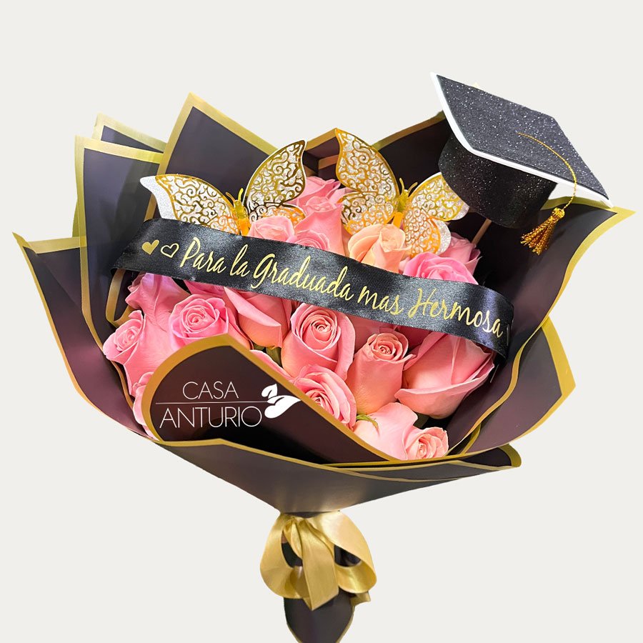 Bouquet de Rosas Rosadas, Mariposas, Cinta y Birrete de Grado