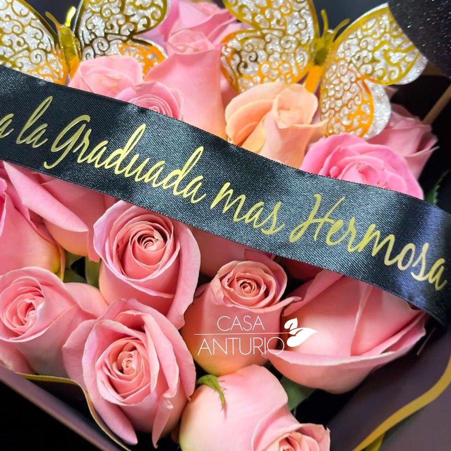Bouquet de rosas rosadas envuelto en elegante papel coreano, con mariposas decorativas, cinta con mensaje y birrete de grado. Un detalle delicado y festivo para celebrar ese logro académico con estilo y alegría. Este arreglo incluye una tarjeta impresa personalizada gratis para que tu mensaje haga este detalle aún más especial.
