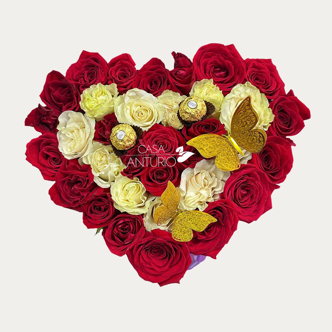 Corazón de Rosas Rojas, Blancas y Mariposas