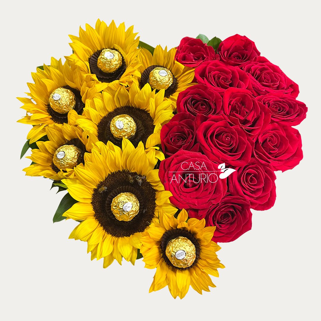Corazón de Rosas y Girasoles con Chocolates