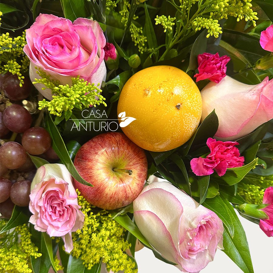Frutero con variedad de frutos frescos, rosas y girasoles. Un detalle colorido y natural que combina la frescura de las frutas con la belleza de las flores, ideal para transmitir alegría, gratitud o buenos deseos en cualquier ocasión especial. Este arreglo incluye una tarjeta impresa personalizada gratis para que tu mensaje haga este detalle aún más especial.