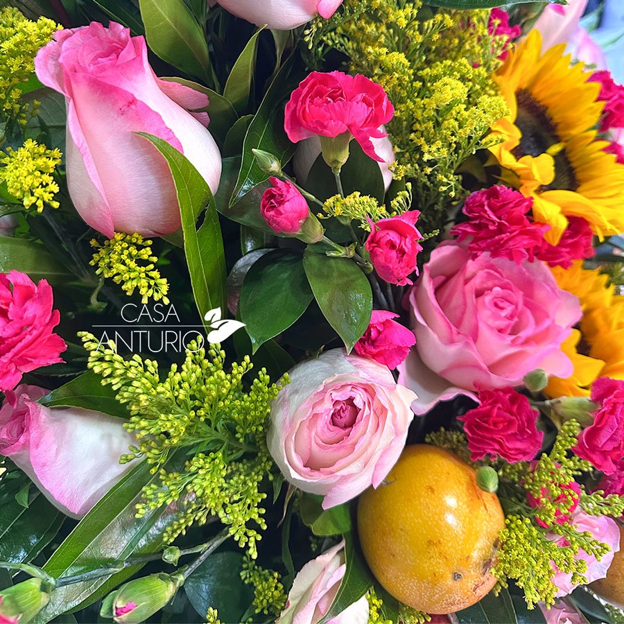 Nota importante: En Casa Anturio trabajamos con flores 100% naturales, cuidadosamente seleccionadas para garantizar frescura y calidad en cada arreglo. Debido a su origen natural, es posible que presenten ligeras variaciones en color, tamaño o forma. Por lo tanto, el producto final puede diferir sutilmente de la imagen de referencia. Sin embargo, te aseguramos que siempre mantendremos la armonía, el estilo y la belleza que caracterizan a nuestros diseños florales.