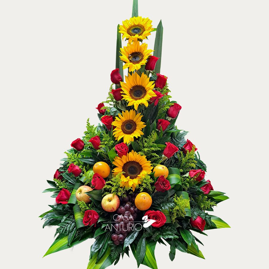 Frutero con variedad de frutas frescas, decorado con rosas y girasoles. Un arreglo colorido y natural que combina la belleza de las flores con la frescura de las frutas, ideal para regalar en celebraciones y ocasiones especiales. Este arreglo incluye una tarjeta impresa personalizada gratis para que tu mensaje haga este detalle aún más especial.